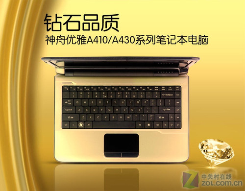 采用时下流行14.0英寸16:9高分辨率(1366*768)LED宽屏设计的神舟优雅A410-P60集娱乐、办公、商用于一身,广达出品,A、C双面均添加了膜内漾印技术处理,拥有钢琴烤漆工艺般的镜面效果,配合钻石线条图案,高贵时尚,尤其是C面的香槟金主色调,与黑色键盘相得益彰,除了在视觉方面不俗表现以外,更带来奢华尊贵的不凡体验;B面边缘也采用统一的高光无痕工艺,让边缘也透出高亮效果,整机和谐而统一。整体纤薄切削设计,外形呈跑车流线型,接口设计合理。