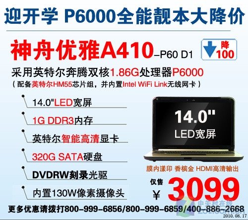 拥有香槟金外观设计的神舟优雅A410系列笔记本电脑,给一贯沉闷的黑色酷睿本世界注入绚丽色彩。尤其是A410-P60的诞生,在三千元价位上刮起香槟金旋风。开学迎新之际,这款拥有32纳米制程的奔腾双核P6000处理器和1GB DDR3内存的实用型笔记本,降价后仅售3099元。
