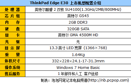 ThinkPad Edge E30 04922ZC笔记本采用配备了英特尔酷睿2双核SU4100处理器(1.3GHz主频/2MB二级缓存/800MHz前端总线)、英特尔GS45芯片组、2GB DDR3内存、320GB SATA硬盘和英特尔GMA 4500M HD集成显卡。目前,该机型的报价为5283元。
