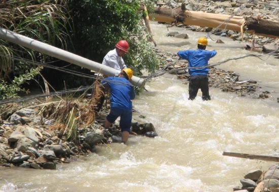 18日下午三点,洪水仍然很大,交通也未恢复,中国移动抢修人员临时调整抢修方案,即沿山脚水边临时向故障点放光缆线,由于电力中断,晚上无法抢修。