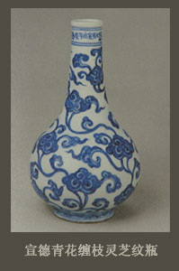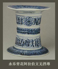 永宣青花当中里边有一部分青花瓷很有意思,它有一种造型、纹饰都是模仿西亚的这么一类青花瓷器。比如说我们经常说的这里边有这种“无挡尊”,还有那种绶带耳葫芦形的扁壶,另外还有这种方流的执壶,还有一种叫“花浇”,就是浇花的“浇”,这类瓷器大概有十多种,它都是模仿伊斯兰国家的这种黄铜、玉器这类的制品。像这种东西一般都认为是郑和下西洋的时候用的,可能是他当时带过去的,或者是作为礼品献给伊斯兰国家的贵族或者国王什么的,很有意思。这种造型出现以后,确实是极大地丰富了中国古陶瓷的造型。这类瓷器的造型到了清代的时候,比如说康熙、雍正、乾隆的时候,曾经大量地仿永宣青花瓷器,好多都是仿这类的东西,到今天也是。