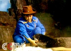 可怎么去教它呢?想想也挺难的。教简这个动作时,李黎都受伤了,她的手被简的前肢爪子挠得都化脓了。简的爪子和狗一样,在毛里藏着尖尖的指甲,需要时指甲能抓挠,不用时就藏在里面,那爪子前面就像老虎爪梅花瓣形状。李黎教简鼓掌时,要让它两只爪子拍在一起,得捧着它的两只前肢,一下一下地教它。开始时它不懂,也许是不适应或是觉得不舒服,老是反对李黎教它,用爪子抓李黎的手。尽管简把李黎的手抓破化脓了,但在李黎的耐心教导下,简终于学会了这个鼓掌动作。当来了游客需要表演时,李黎就给它打一个手势,让简去对游客鼓掌欢迎。简马上就过去了,一边鼓掌,一边不时地朝李黎张望着。原来它心里在惦记着李黎给它好吃的呢。李黎在训练它时就是采用食物奖励的办法。它知道做得好就有好吃的,这聪明的小东西!