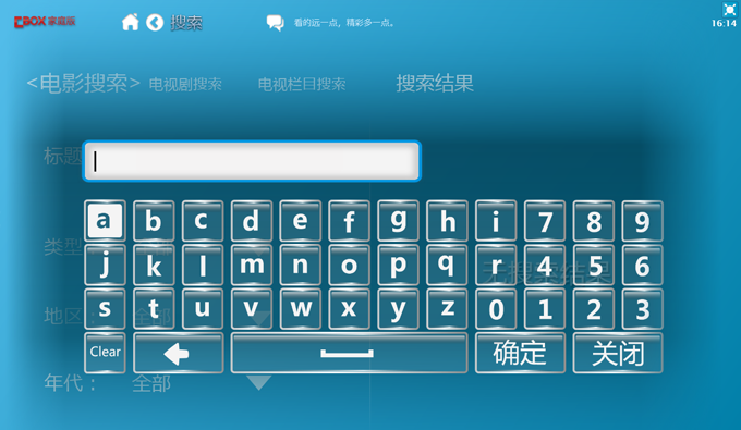当用户通过键盘来进行搜索时,我们提供关键字搜索,只要在输入框中输入所要查询的节目名称或部分节目名称,就可以在右侧获得搜索结果。
