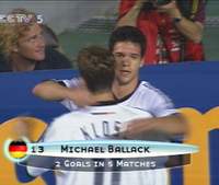 德国队与美国队的比赛进行到第39分钟,德国队获前场任意球,球开出后,13号巴拉克在门前高高跃起,头球破门,德国队1比0领先。
