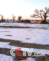 我们摄制组从库尔勒出发,在到轮南的途中有很大一片的戈壁滩,在那里我们看到了挂了霜的胡杨。茫茫戈壁,只有这些胡杨孑然挺立。胡杨并不很高,也许是因为缺乏水分的原因,但是它的形状却是极有棱角的样子,很有一种威严在里面。地上还有一些积雪没有化,有风过的时候,树上的霜会悠然而落,因为天气寒冷,远处的天空也泛着淡白,所以在这里,大地、胡杨、天空全部融为了一体。