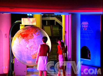 在另一个展厅内,女孩们玩得真开心,她们在做什么呢?看看旁边的屏幕,原来她们玩的是一场排球比赛,可是为什么从她们的手中却没有看到一点排球的影子呢?原来,这是一个利用计算机以及光电技术构成的虚拟系统,摄像机拍摄到参观者的活动图像,这些图像数据被传到计算机中与虚拟的排球进行合成。在电脑屏幕上,当参观者的肢体碰到排球时,计算机就会计算出排球下一步的运动轨迹,并发出指令,最后,这个过程通过声像技术显现在屏幕上。