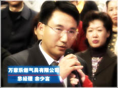 余少言:非常感谢《中国电视报》、中央电视台以及全国广大电视观众,通过大家努力,使“万家乐杯观众喜爱的演员活动”顺利展开,万家乐作为中国的驰名商标和中国名牌,一直以来为广大消费者提供优质产品。与此同时,万家乐也关注广大老百姓的文化生活,我们通过推广、推动这次“万家乐杯的观众最喜爱的演员的活动”,使我国电视剧的制作水平进一步提升,我们也衷心希望更多更优秀的电视剧作品展现在广大老百姓面前,供人们来欣赏。